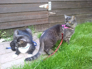 Kun ulos sitten päästään niin piha pitää tutkia perinpohjaisesti. Ruohoa myös maistellaan ja ötököitä jahdataan. Palvelusväen tehtäväksi jää narujen selvittäminen, kun kaksikko syöksähtelee paikasta toiseen :D Välillä vaan lepäillään viileillä laatoilla ja haistellaan kesän tuoksuja :)